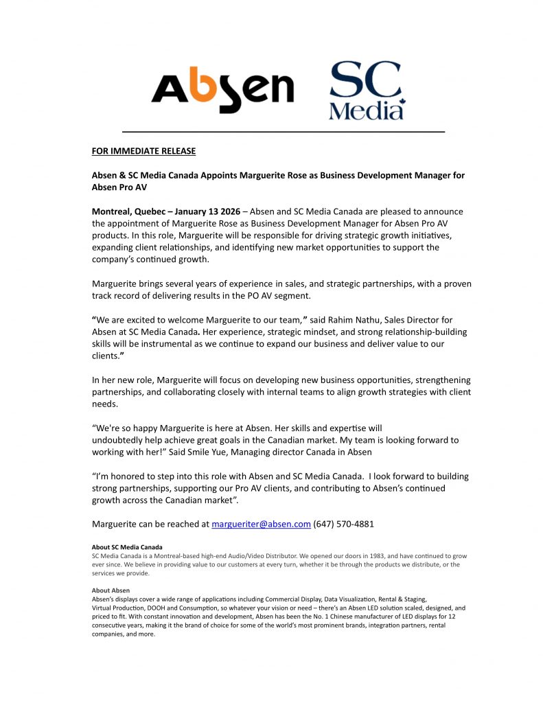 January 14th, 2026 – In partnership with AbsenLED, SC Media Canada is proud to announce the appointment of Marguerite Rose as Business Development Manager for Absen Pro AV products in Canada. See below for the joint statement.